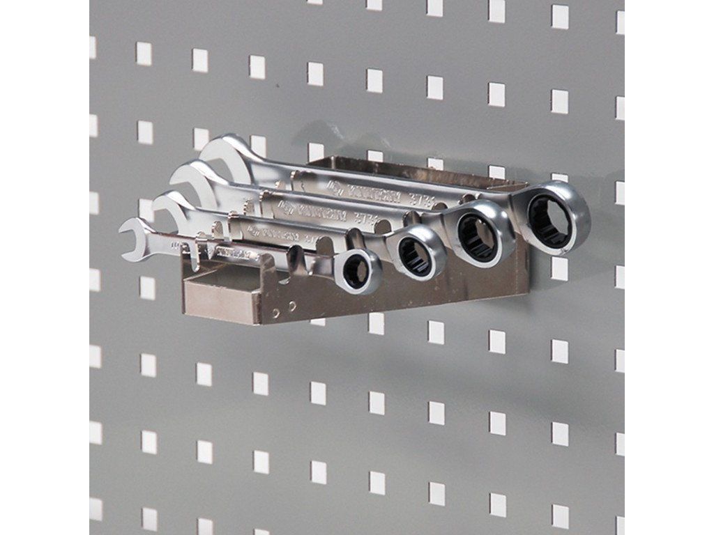 Držák 8 ks plochých klíčů je určen pro děrované desky s roztečí 38 x 38 mm. Lze jej připevnit také na perforované panely sestav dílenského nábytku, dílenské vozíky, pracovní stoly a policové regály.