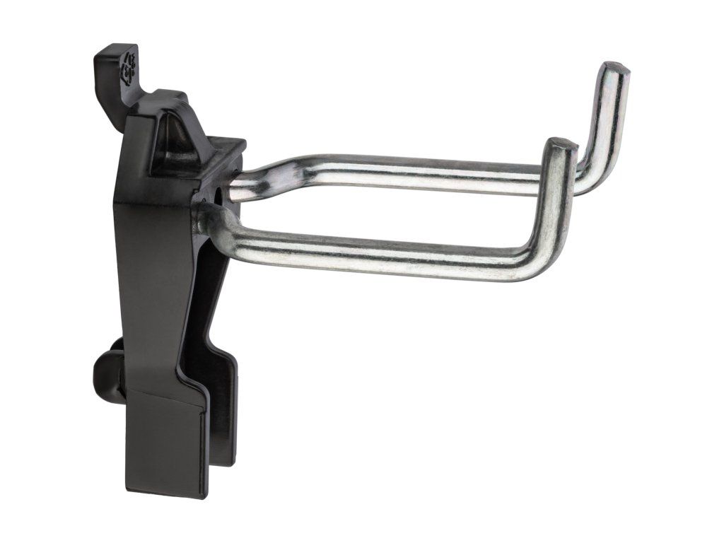Dvojitý hák, široký, dlouhý 50 mm je určen pro děrované desky s roztečí 38 x 38 mm. Připevněním na perforovaný panel lze rozšířit úložný prostor také pro sestavy dílenského nábytku, dílenské vozíky s nářadím i bez nářadí, pracovní stoly i policové regály.