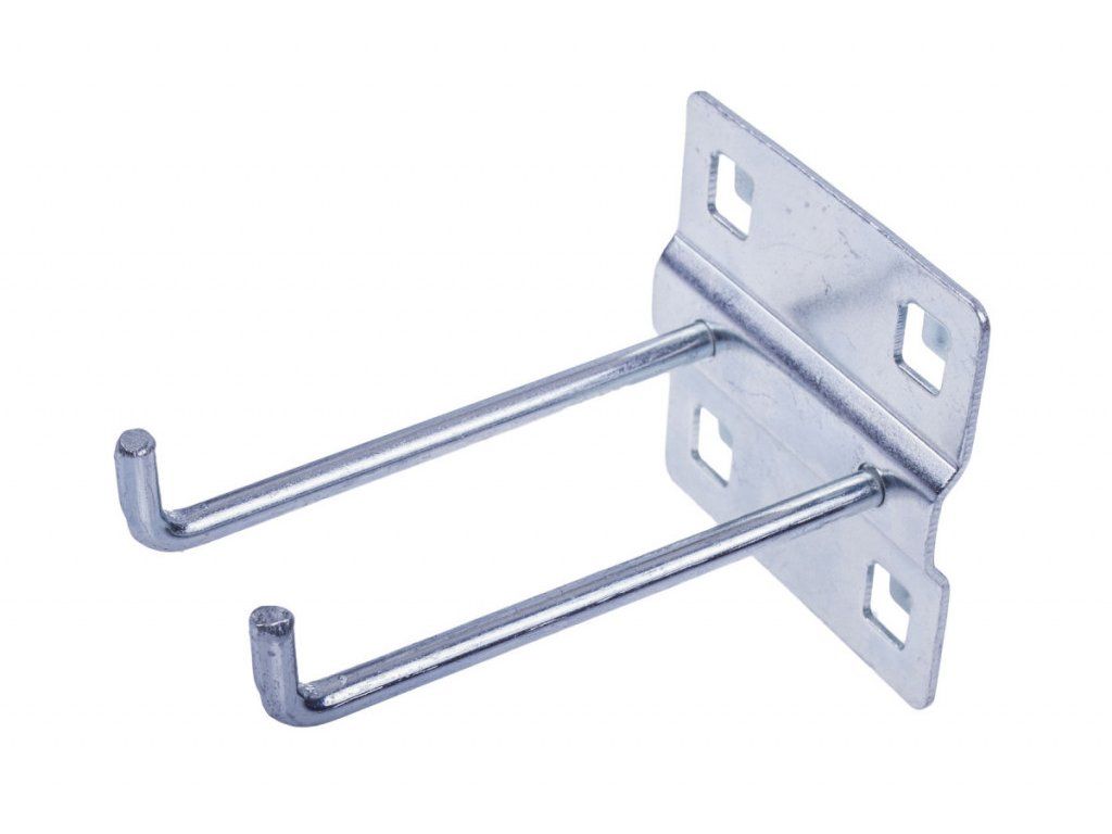 Dvojitý hák dlouhý 87 mm je určen pro děrované desky s roztečí 38 x 38 mm. Připevněním na perforovaný panel lze rozšířit úložný prostor také pro sestavy dílenského nábytku, dílenské vozíky s nářadím i bez nářadí, pracovní stoly i policové regály.