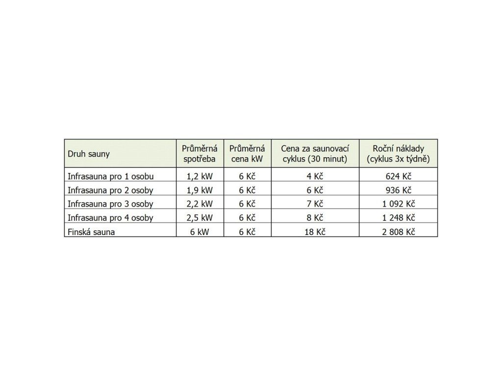 Infrasauny jsou energeticky nenáročné spotřebiče , náklady na energii se pohybují v závislosti na velikosti infrasauny pro každý Váš pobyt v infrasauně okolo 4 - 8 Kč. Záleží na velikosti a kapacitě infrasauny, čím větší infrasauna, tím vyšší výkon potřebuje. Níže naleznete tabulku uvádějící průměrnou spotřebu a přibližnou cenu za saunovací cyklus daného typu infrasauny.