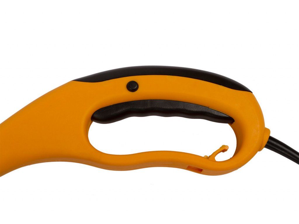 Horní rukojeť má prodlouženou spoušť s bezpečnostní pojistkou. Samozřejmostí je háček pro zaháknutí napájecího kabelu.