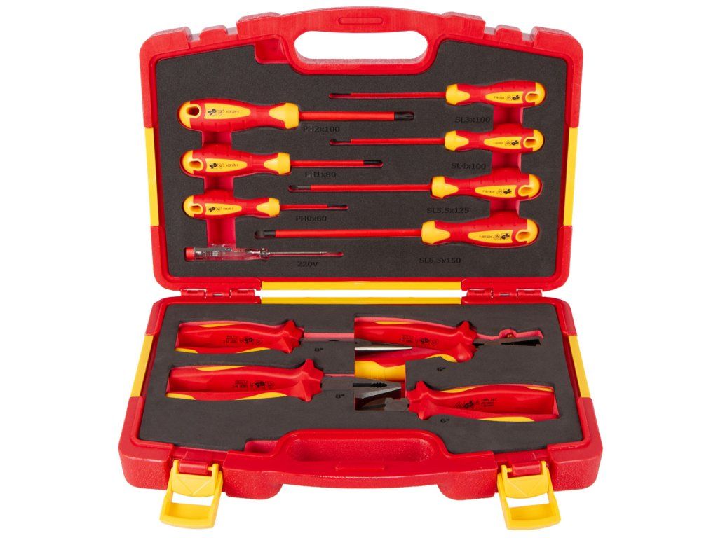 Sada VDE izolovaného nářadí obsahuje 12 kusů profesionálního nářadí, které splňuje přísné normy VDE a GS.