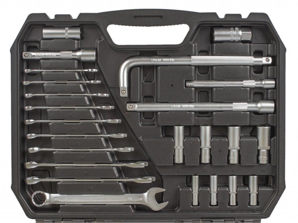 Sada obsahuje ráčny 1/4", 3/8" a 1/2", nástrčné klíče, prodloužení, kardanové klouby, očkoploché klíče a mnoho dalšího.
