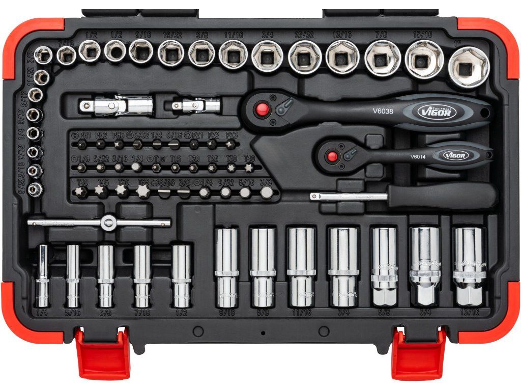 92dílná palcová gola sada Vigor V2470N je určena pro ruční ovládání šroubových spojů u vozidel a strojů s americkými palcovými rozměry. Ideálně se hodí při servisu vozidel z amerického trhu, jako jsou FORD Mustang, CHEVROLET Camaro, DODGE Charger, JEEP Wrangler, Harley-Davidson a další.