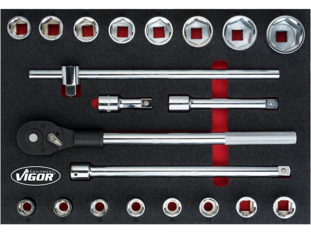 Sada s nástrčnými klíči 21 ks ve výplni do dílenského vozíku o rozměru 563x393 mm obsahuje: