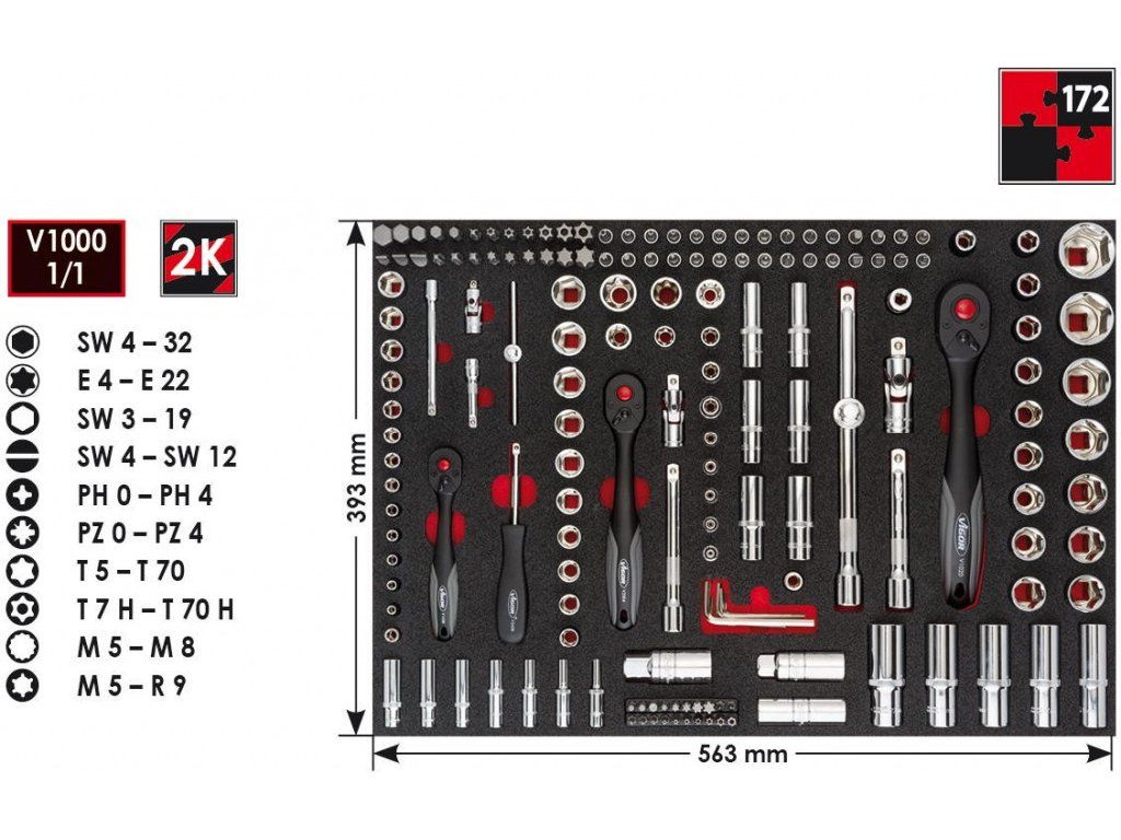 - 24 ks nástrčné klíče 1/2": 10; 11; 12; 13; 14; 15; 16; 17; 18; 19; 20; 21; 22; 24; 27; 30; 32 mm