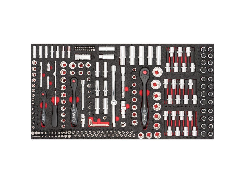 Pěnová vložka o rozměrech (š x h x v) 750 x 393 x 35 mm obsahuje celkem 219 ks profesionálních oboustranných klíčů.
