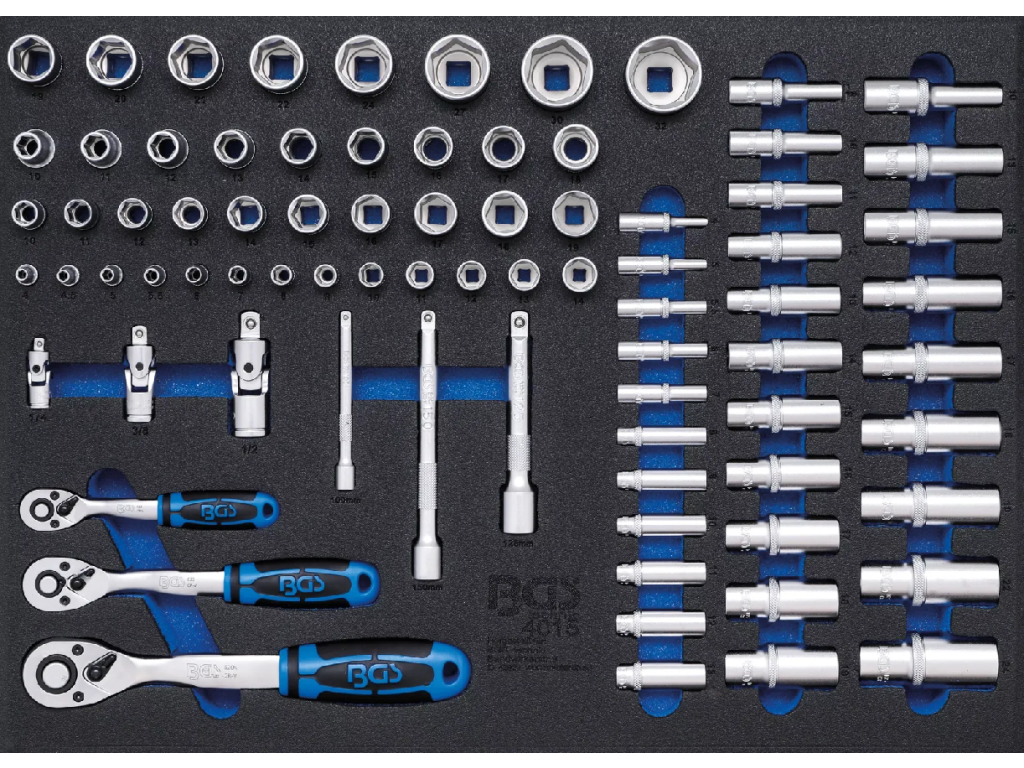 Pěnová vložka o rozměrech (š x h x v) 567 x 408 x 32 mm obsahuje gola sadu 80 ks se čtyřhranem 1/2", 3/8", 1/4".