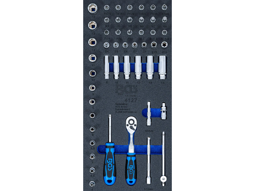 Pěnová vložka o rozměrech (š x h x v) 189 x 408 x 48 mm obsahuje gola sadu 50 ks se čtyřhranem 1/4".