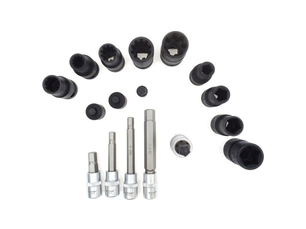 Speciální sada hlavic určená pro servis brzdových třmenů osobních vozidel, včetně specifických aplikací u značek Audi, VW a dalších.