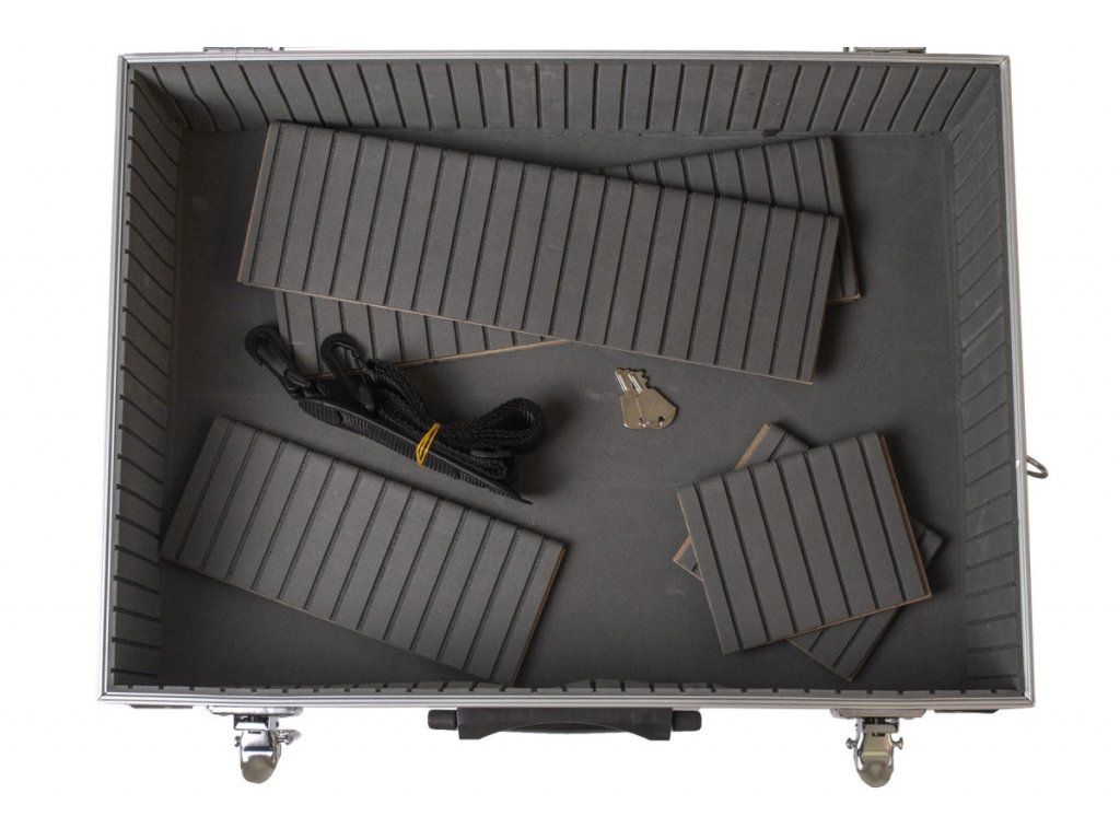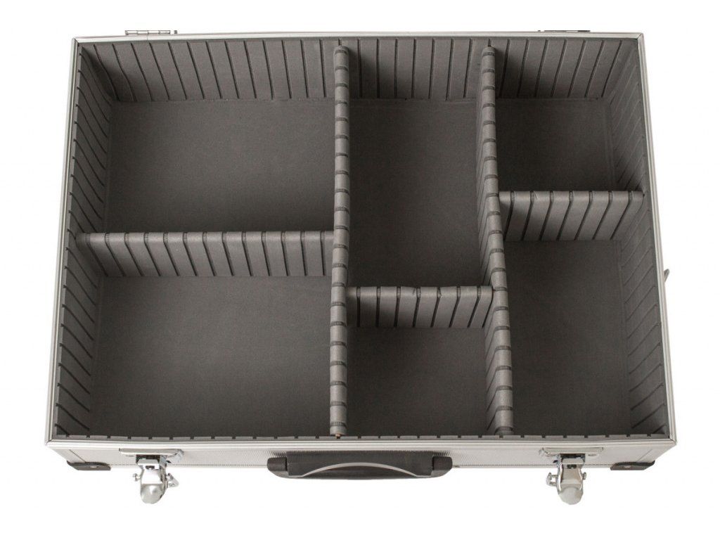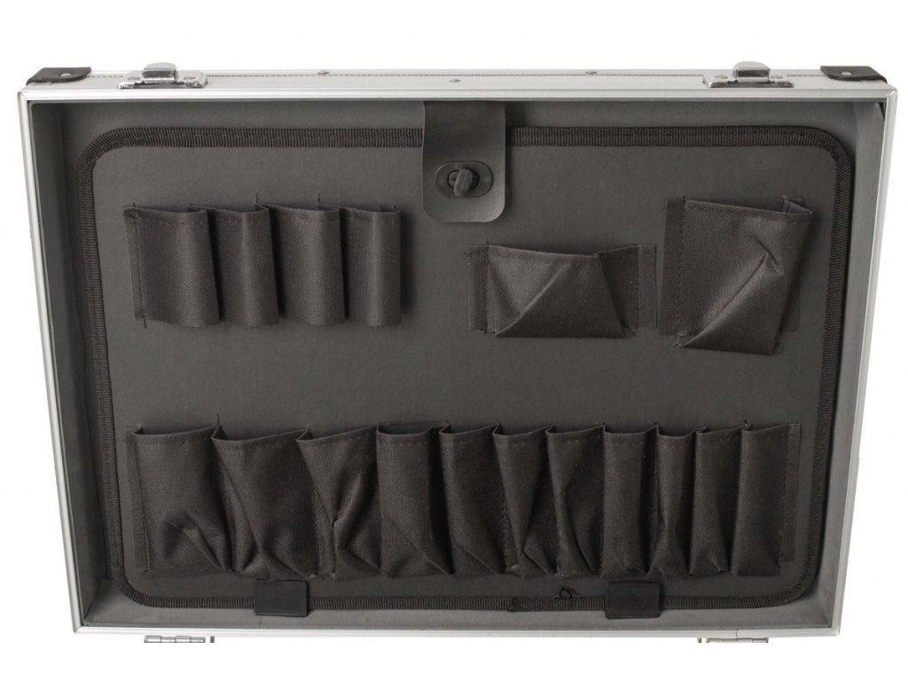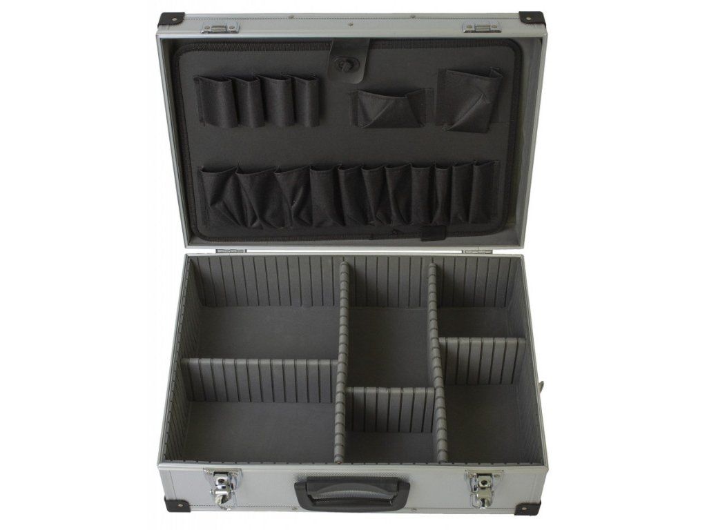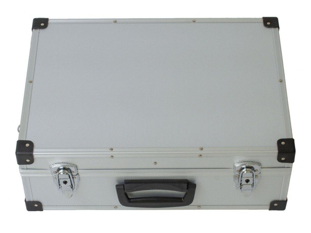Hliníkový kufr na nářadí o rozměrech (š x h x v): 460 x 330 x 150 mm. Kufr je lehce přenosný díky madlu, nebo přídavnému popruhu na ramena.
