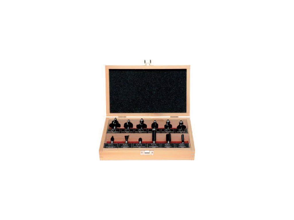Horní frézy - sada 12 kusů v kvalitní dřevěné kazetě Dřík- průměr: 8 mm A.Fazetová fréza, průměr 28,6 mm B.Zaoblovací fréza, průměr 24,7 mm + 32,7 mm C.Žlábkovací fréza, průměr 22,0 mm + 28,5 mm D.Profilová fréza, průměr 35 mm E.Drážkovací fréza, průměr 8 mm + 16 mm F.Zarovnávací fréza, průměr 12,7 mm G.Drážkovací kulatá fréza, průměr 12,0 mm H.Falcovací fréza, průměr 14,3 mm I.Drážkovací klínová fréza 60°, průměr 11 mm Horní frézy v sadě pro univerzální použití Víceúčelová obsáhlá kolekce - pokryje všechny běžně užívané druhy fréz Vysoce kvalitní tvrdokovová špice - dlouhá životnost - zajistí čistý a přesný řez Tělo frézy pokrývá vrchní vrstva proti ulpívání materiálu - vylepšený odvod hoblin - v průběhu užívání minimalizuje ztrátu energie - zabraňuje hromadění pryskyřice a lepidla na těle frézyDoplňkové parametry