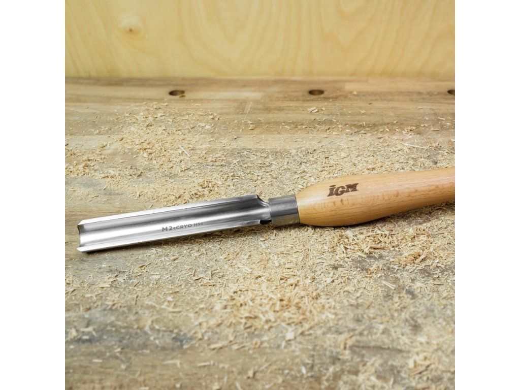 IGM Cryo Soustružnické dláto hrubovací se používá pro hrubování předem neopracovaného materiálu. Slouží k první úpravě hranatého materiálu na kulatý obrobek nebo k velkému úběru materiálu. Je vhodné jak pro začátečníky, tak i zkušené soustružníky. Čepel 28x150 mm z HSS oceli M2 je kryogenicky zpracovaná, což zaručuje dlouhou životnost a mnohonásobně vyšší zachování ostří než u běžných dlát. Kryogenicky zušlechtěná ocel M2 na tvrdost 63-65 HRC je velmi odolná proti vysokým teplotám a nespálí se ani při soustružení velmi tvrdých, vysušených dřevin. Masivní ergonomická rukojeť z bukového dřeva je pevná pro komfort a jistotu při práci.