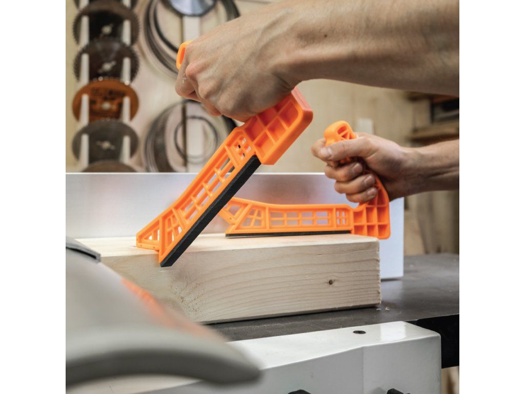 Sada 2 ks malých protiskluzových podavačů k bezpečnému posuvu materiálu při řezání na stolní a pásové pile je alternativou k strojním podavačům. Nikdy neproklouznou a snadno se čistí.