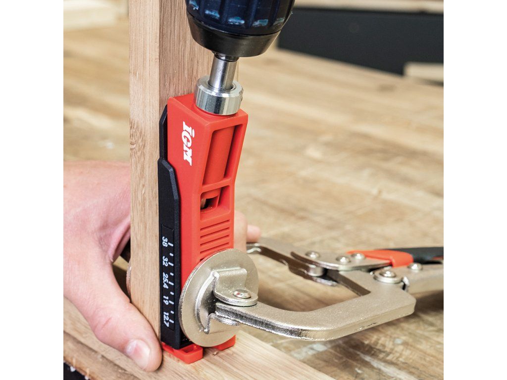 Svrtávací přípravek IGM pomůže vytvořit pevný spoj dřevěných dílců, například při montáži skříněk nebo jiného nábytku. Přípravek slouží k vrtání otvorů pro skryté šroubované spoje, s použitím vrtačky je vyvrtáte snadno a rychle. Vrtací pouzdro z tvrzené oceli vede HSS vrták o průměru 9,5 mm do materiálu o tloušťce 12 – 40 mm. Pomocí stupnice ze spodu přípravku si snadno nastavíte doraz, stačí jen změřit tloušťku materiálu. Vrtací pouzdro pak posunete dle naměřené tloušťky. Pouzdro drží pevně na místě díky magnetu a zářezům v těle přípravku. Čtyřhranným bitem Robertson č. 2 zašroubujete do vyvrtaného otvoru Pocket Hole vruty. Otočnou zarážku využijete při vrtání o hranu dílce nebo při zpevňování již spojeného materiálu, například pokosového spoje. Abyste přípravek při fixaci na dílec nemuseli složitě přidržovat, je plochá horní část vybavena magnetem, ke kterému se přichytí čelist Pocket Hole svěrky.