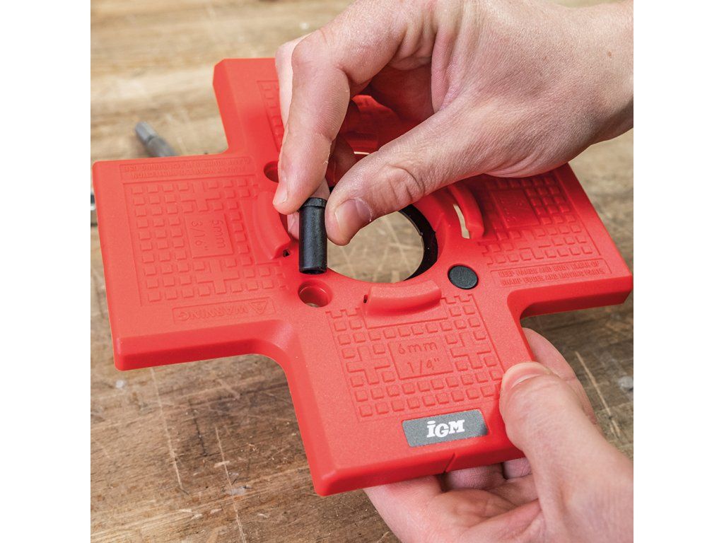 Montáž dvířek ke korpusu Vám usnadní tato šablona pro vrtání 35 mm misek nábytkových pantů. NK panty (závěsy) namontujete během chvilky bez nutnosti zdlouhavého měření a značení. Šablonu se sukovníkem 35 mm s válcovou stopkou můžete upnout do jakékoli vrtačky. Díky hloubkovému dorazu vyvrtáte misku vždy do stejné hloubky, v materiálu o minimální tloušťce 18 mm. Šablona je vybavena plastovými dorazy, kterými v rychlosti nastavíte odsazení misky od hrany dvířek ve vzdálenosti 3 mm, 4 mm, 5 mm nebo 6 mm. Součástí je i magnetická šablona na vyvrtání otvorů pro vruty, kterými se připevňuje pant na dvířka (vrták není součástí balení). Otvory mají rozteč 45 mm a jsou vzdáleny od osy misky 9,5 mm, magnetickou šablonu tak lze použít například pro panty od výrobců Blum, Strong či Hettich.