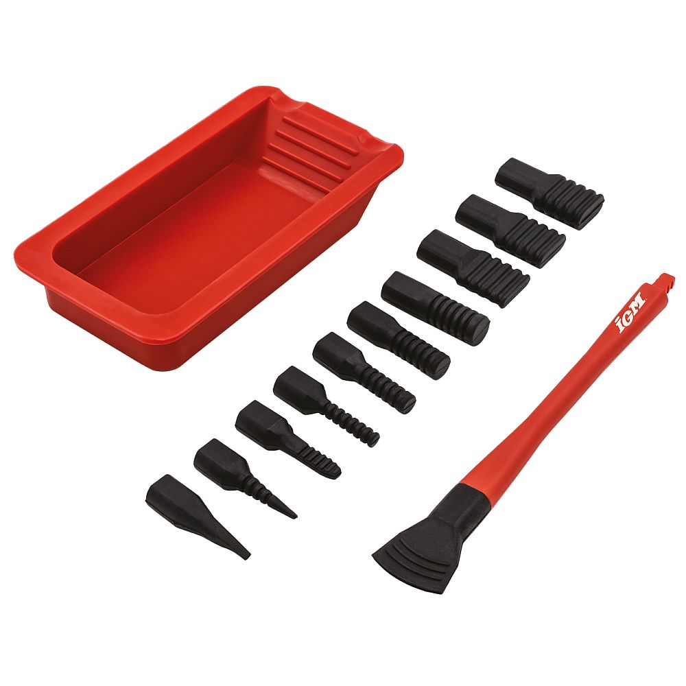 IGM Silikonová sada s aplikátory v 10 velikostech vám usnadní nanášení lepidla do otvorů pro kolíky, DOMINO kolíky či lamely, a také do drážek, spár nebo jiných otvorů. Měkké silikonové nástavce rovnoměrně rozetřou lepidlo po celé ploše dřeva uvnitř každého otvoru.