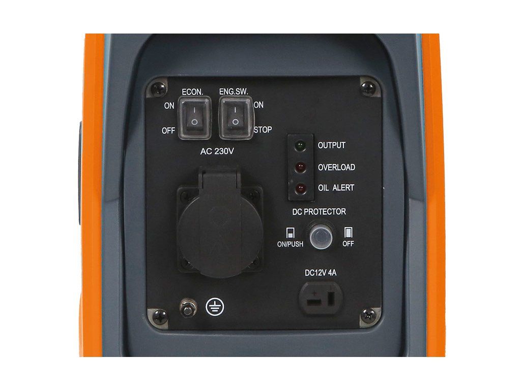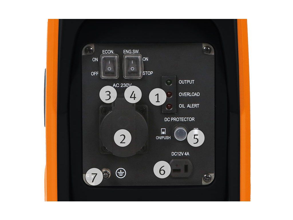 - Kontrolky výstupního napětí, přetížení a nedostatku oleje