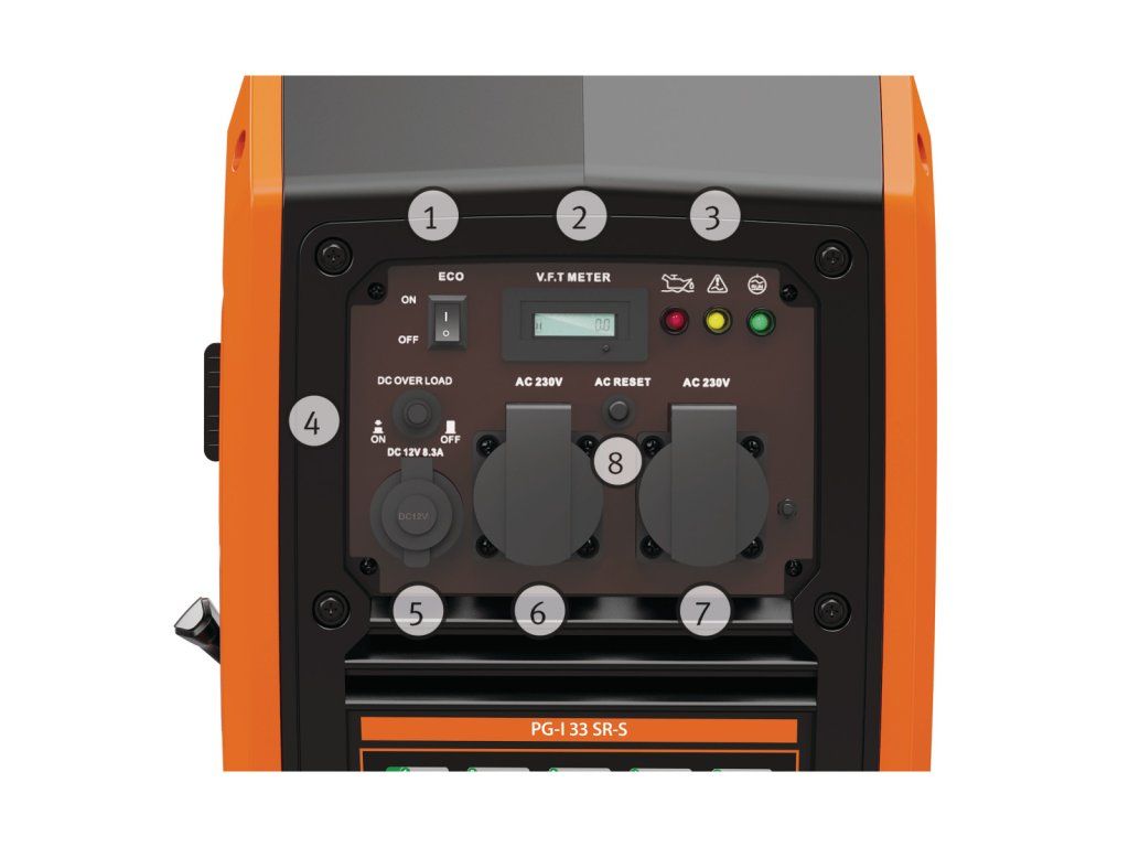 - Kontrolky výstupního napětí, přetížení a nedostatku oleje