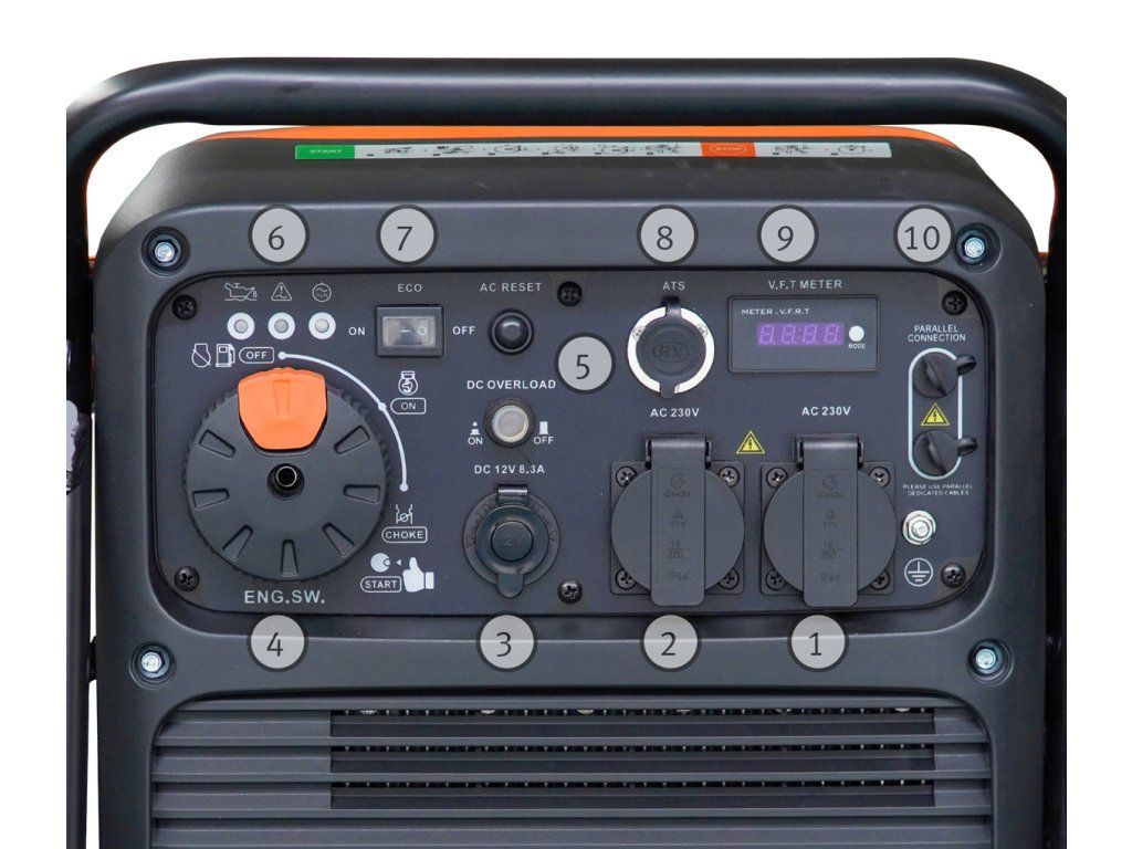 - Kontrolky výstupního napětí, přetížení a nedostatku oleje