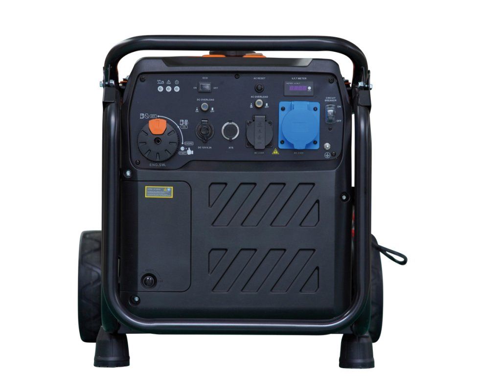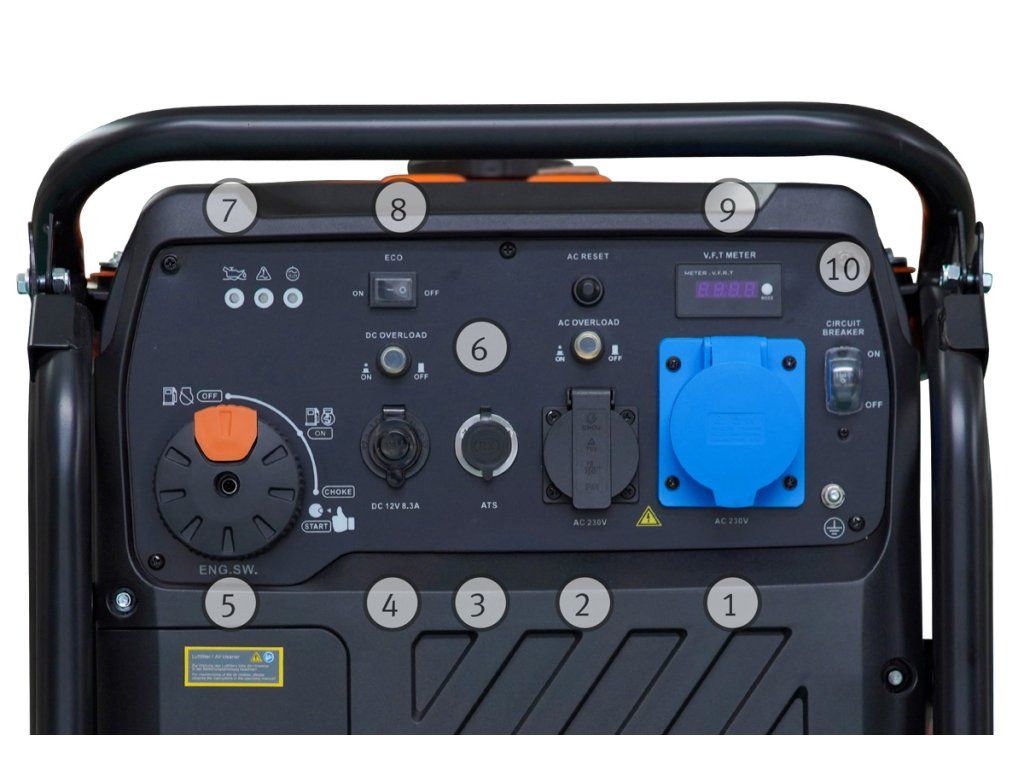 - Kontrolky výstupního napětí, přetížení a nedostatku oleje