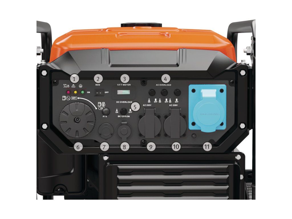 - Kontrolky výstupního napětí, přetížení a nedostatku oleje