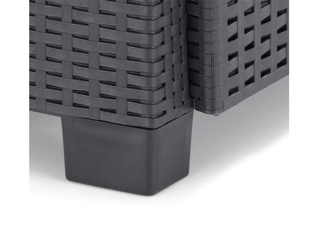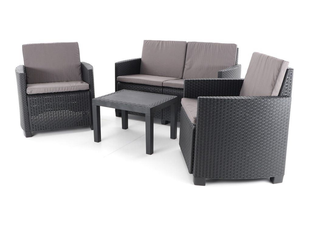 Stolová sestava se skládá ze 2 pohodlných křesel, lavice a stolku v imitaci umělého ratanu s UV filtrem.