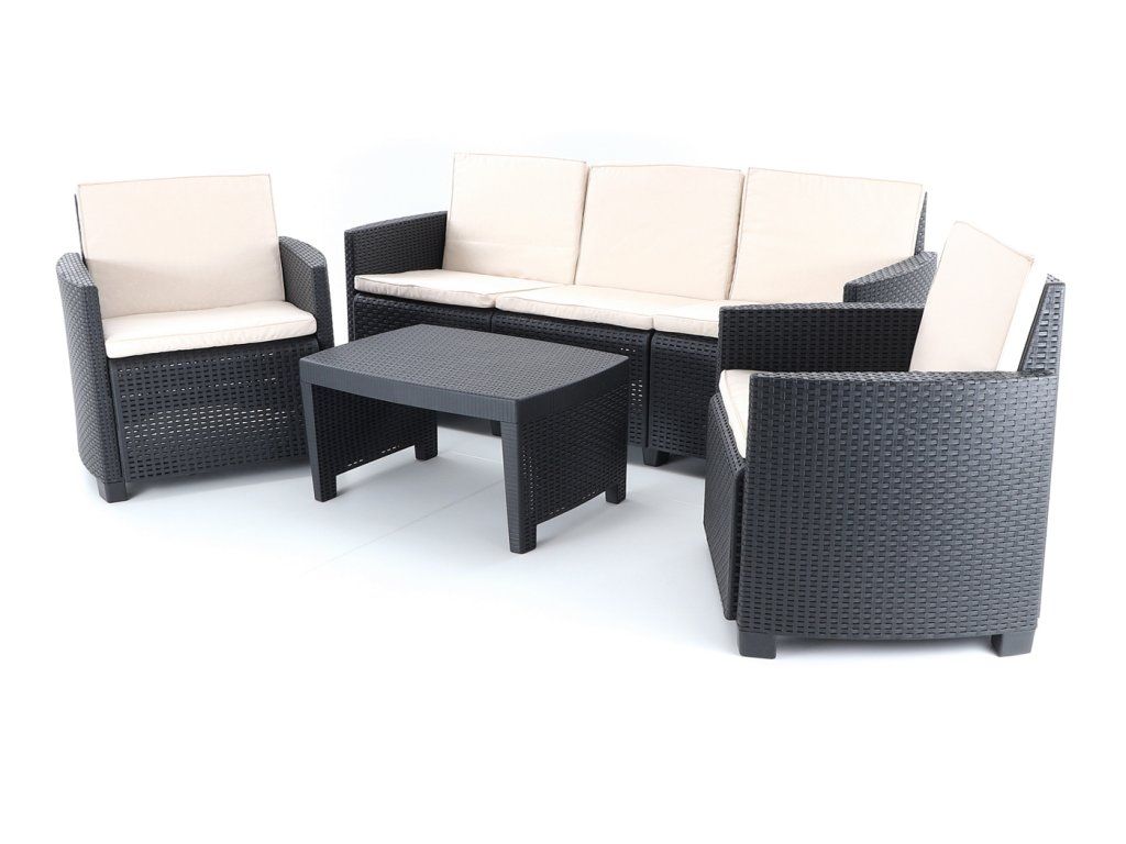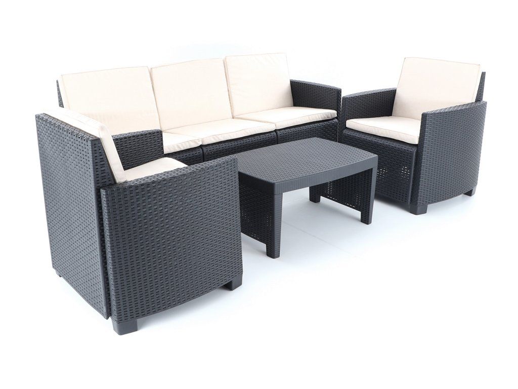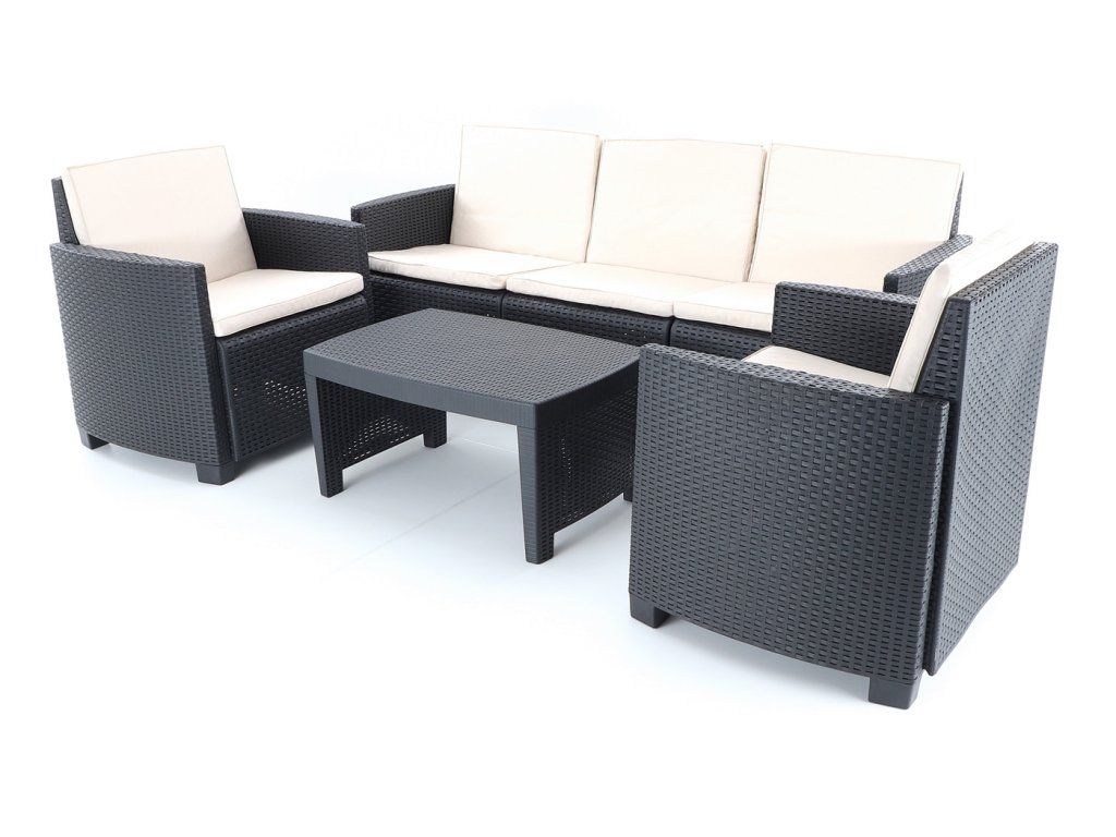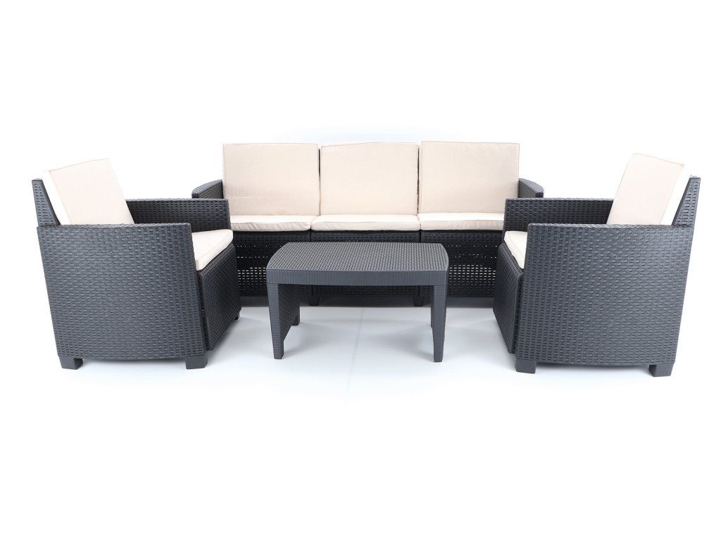 Stolová sestava se skládá ze 2 pohodlných křesel, třímístné lavice a stolku v imitaci umělého ratanu s UV filtrem.