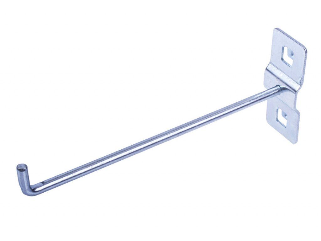 Jednoduchý hák dlouhý 150 mm je určen pro děrované desky s roztečí 38 x 38 mm. Připevněním na perforovaný panel lze rozšířit úložný prostor také pro sestavy dílenského nábytku, dílenské vozíky s nářadím i bez nářadí, pracovní stoly i policové regály.