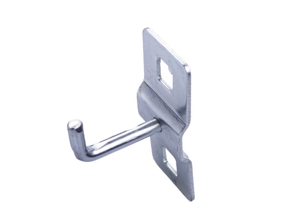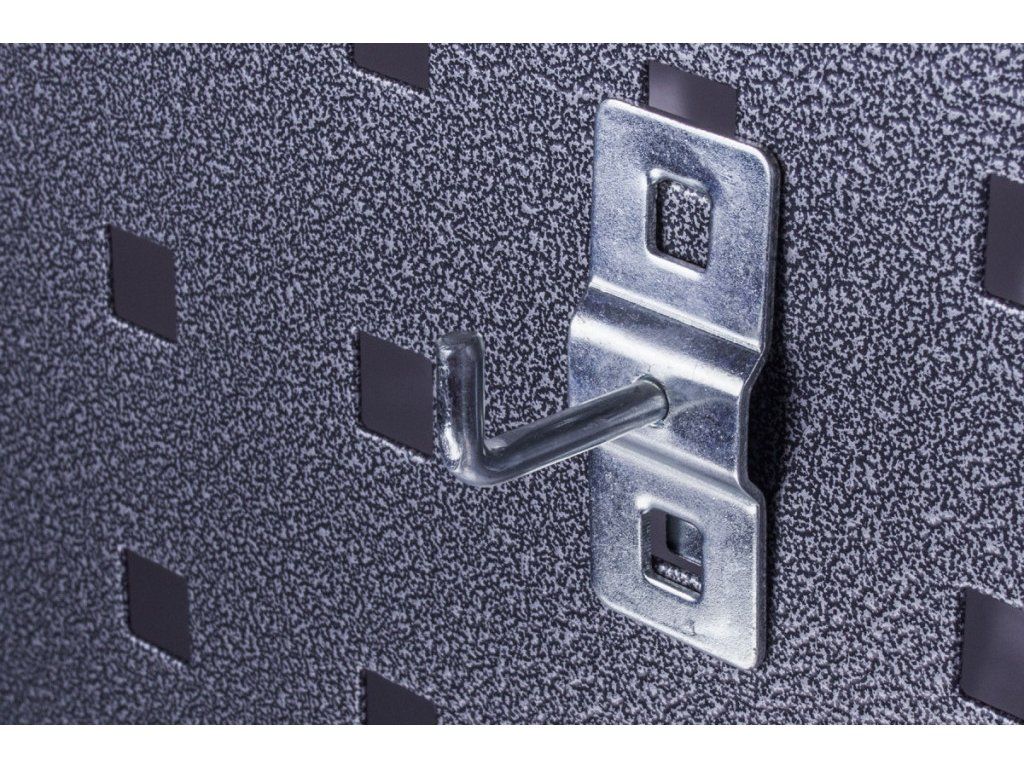 Jednoduchý hák dlouhý 35 mm je určen pro děrované desky s roztečí 38 x 38 mm. Připevněním na perforovaný panel lze rozšířit úložný prostor také pro sestavy dílenského nábytku, dílenské vozíky s nářadím i bez nářadí, pracovní stoly i policové regály.