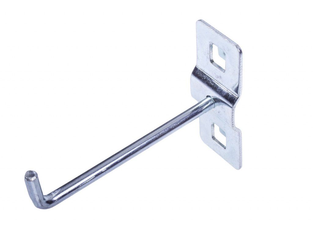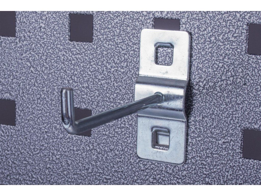 Jednoduchý hák dlouhý 87 mm je určen pro děrované desky s roztečí 38 x 38 mm. Připevněním na perforovaný panel lze rozšířit úložný prostor také pro sestavy dílenského nábytku, dílenské vozíky s nářadím i bez nářadí, pracovní stoly i policové regály.