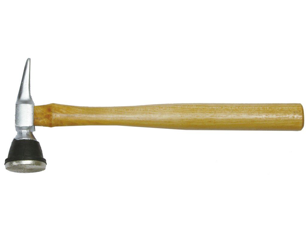 Karosářské kladivo s dřevěnou násadou o délce 310 mm se speciálně tvarovanou spirálovou hlavou, která napomáhá smršťovat kov při nárazu a druhým, špičatým koncem hlavy.