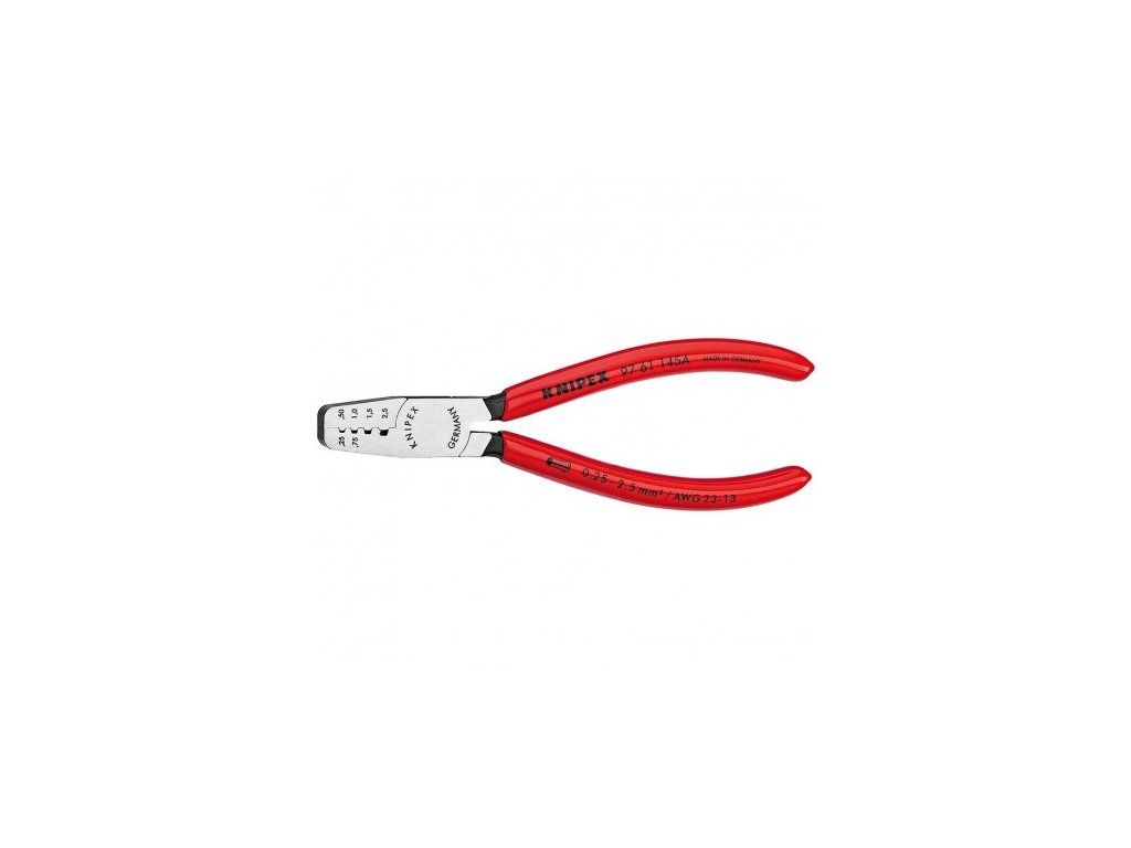 97 61 145A Kleště na kabelové koncovky K lisování dutinek DIN 46228 část 1 + 4 v rozsahu 0,25 až 2,5 mm2 Lisování do označených lichoběžníkových profilů pro spolehlivé spojení dutinky a vodiče vanadová elektroocel; kovaná, kalená v oleji Hlava: Leštěno Rukojeti: Potaženo plastem Použití: Dutinky Kapacita: 0,25 - 2,5 mm2 AWG: 23 - 13 Počet hnízd: 6 Ks Délka: 145 mm Hmotnost: 140 g Podrobnější informace ke zboží naleznete v katalogu KNIPEX v sekci "Katalogy"Doplňkové parametry