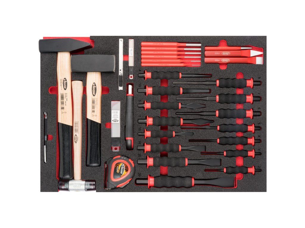 Pěnová vložka o rozměrech (š x h x v) 563 x 393 x 35 mm obsahuje celkem 51 ks profesionálních sekáčů, vyrážečů kladiv a paličky.