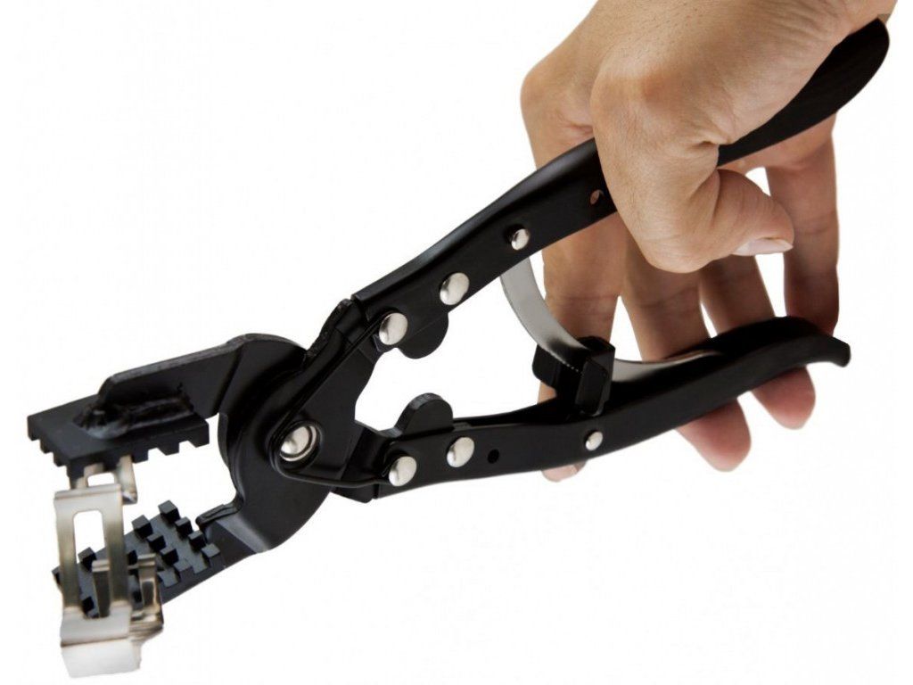 Kleště s křížovým provedení čelistí zajišťující bezpečné a snadné uchopení, uvolnění a sejmutí spony.
