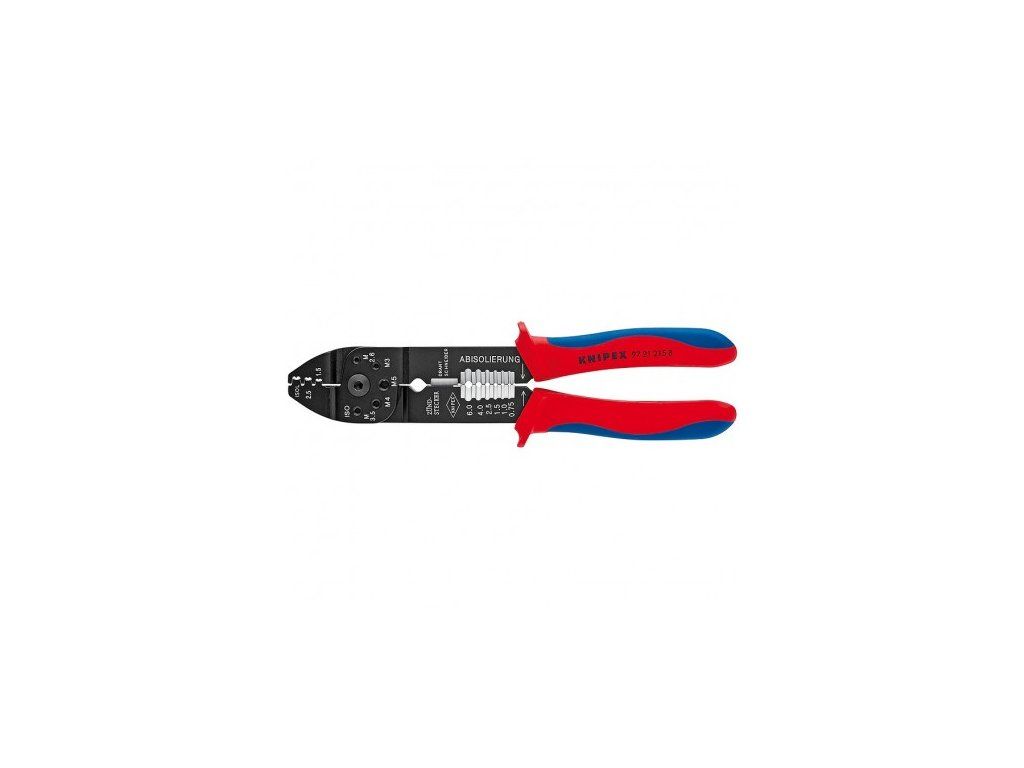 97 21 215B Lisovací kleště K stříhaní kabelů, odizolování drátů a lisování izolovaných a neizolovaných kabelových ok a konektorů a otevřených konektorů S otvory se závitem k stříhání měděných nebo mosazných závitových kolíků s M 2,6; 3,0; 3,5; 4,0 a 5,0 mm speciální ocel, vysoce pevná Hlava: Brunýrované Rukojeti: S plastovými návleky rukojetí Použití: Neizolované otevřené konektory (6,3 mm šířky zástrček) Kapacita: 0,5 - 2,5 mm2 AWG: 20 - 13 Počet hnízd: 3 Ks Délka: 215 mm Hmotnost: 221 g Podrobnější informace ke zboží naleznete v katalogu KNIPEX v sekci "Katalogy"Doplňkové parametry