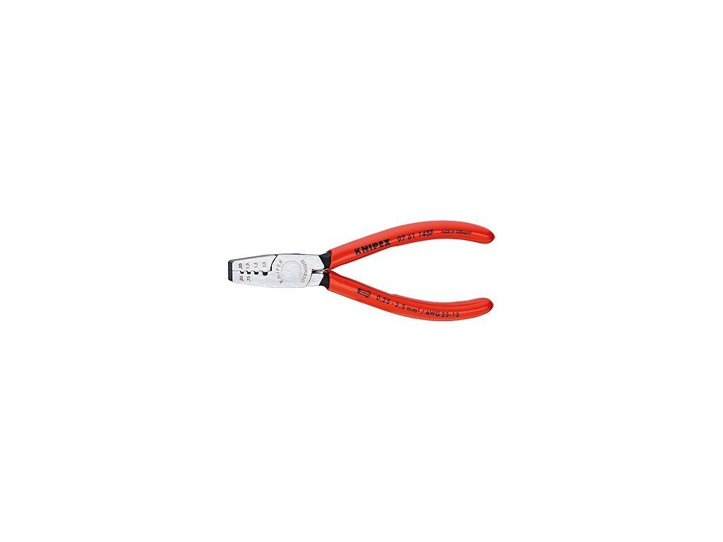 97 61 145F Kleště na kabelové koncovky K lisování dutinek DIN 46228 část 1 + 4 v rozsahu 0,25 až 2,5 mm2 Lisování do označených lichoběžníkových profilů pro spolehlivé spojení dutinky a vodiče vanadová elektroocel; kovaná, kalená v oleji Podrobnější informace ke zboží naleznete v katalogu KNIPEX v sekci "Katalogy"Doplňkové parametry