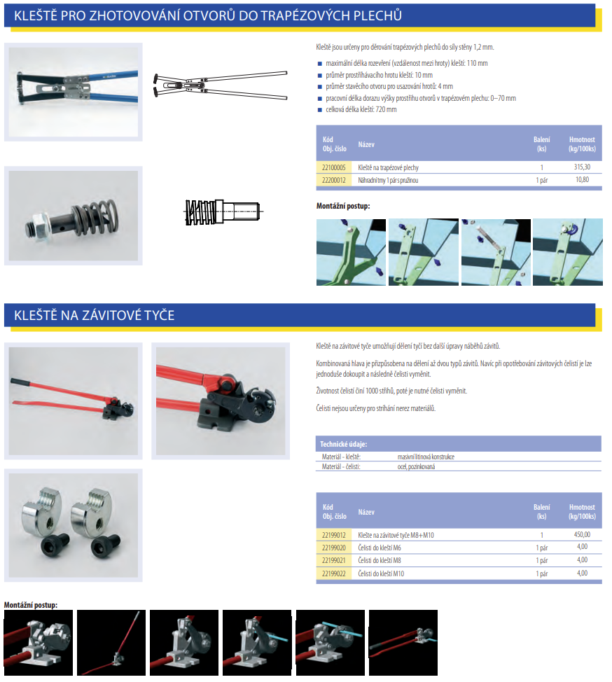 Díky pevné konstrukci a ergonomickému tvaru umožňují snadnou manipulaci i při opakovaných úkonech bez únavy. Maximální rozevření čelistí cca 110 mm dovoluje pohodlně uchopit a zpracovat velké profily trapézových plechů.