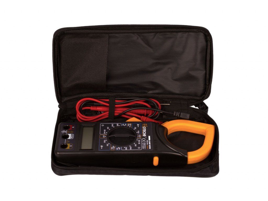 Klešťový multimetr je dodáván v praktickém obalu, v kterém jsou přiložené hroty na měření, pásek, který zabrání pádu na zem, a 9V baterie, kterou je přístroj napájený.
