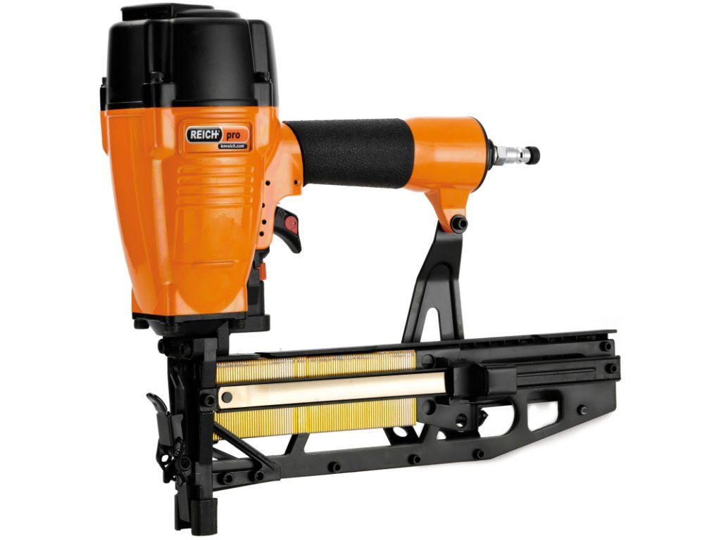 Kombinovaná hřebíkovačka, sponkovačka typu 3718 KM Reich, pro sponky typu Q a G a T-hřebíčky. Praktické odklopení hlavy pro vytažení zaseknuté sponky nebo hřebíčku, regulátor pro seřízení hloubky zaražení sponky nebo hřebíčku.