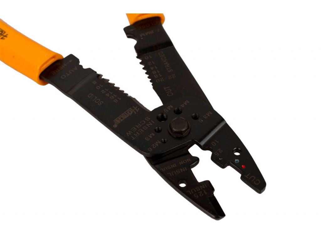 Konektorové kleště o délce 215 mm značky Hoteche využijete k odizolování drátů, stříhání kabelů, lisování izolovaných a neizolovaných kabelových ok a konektorů a otevřených konektorů.