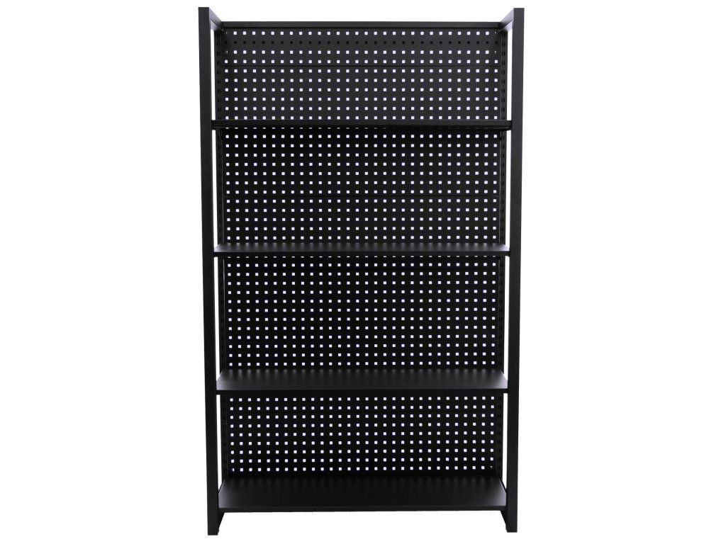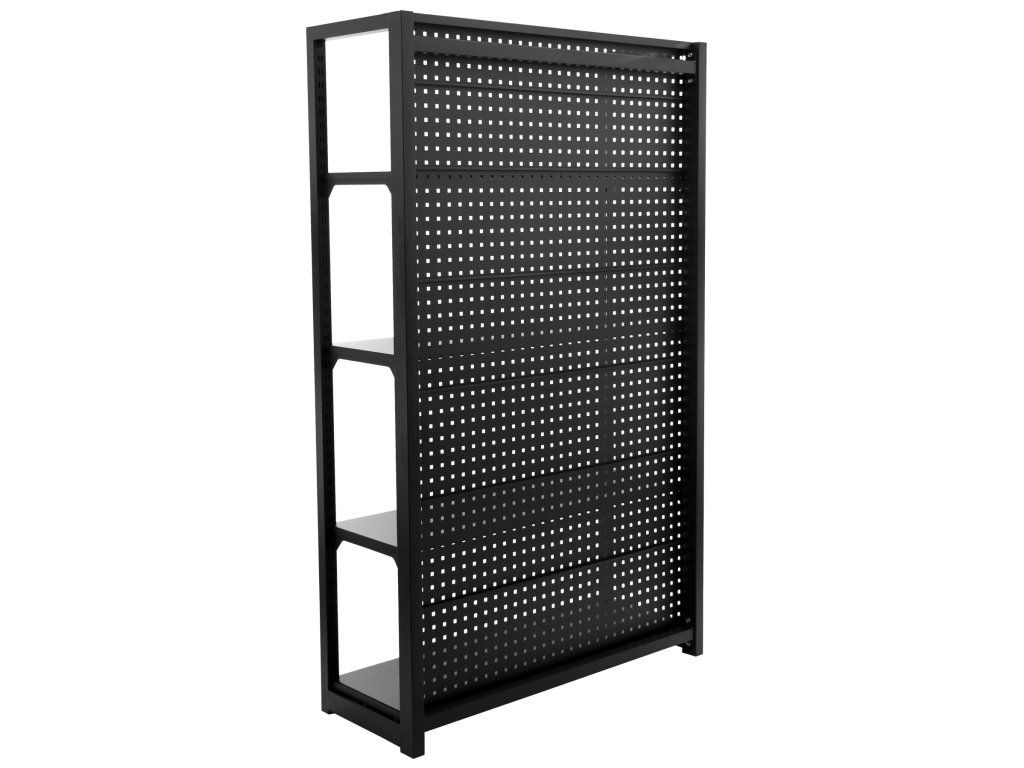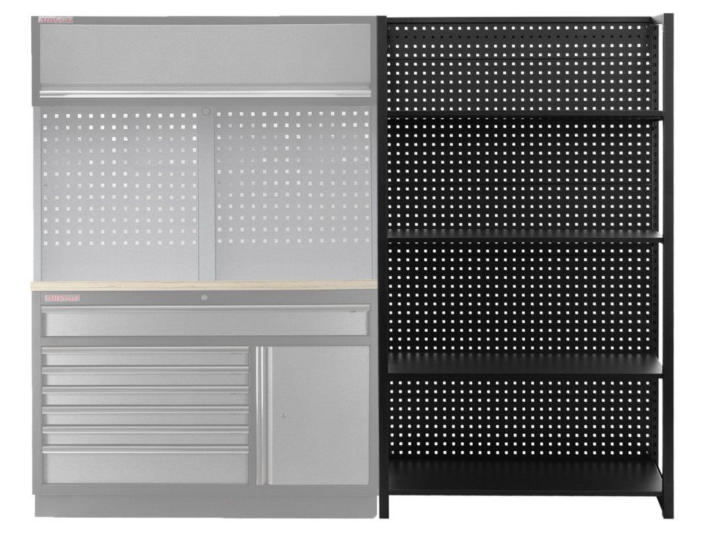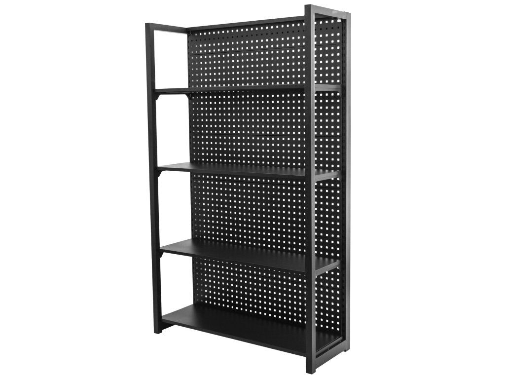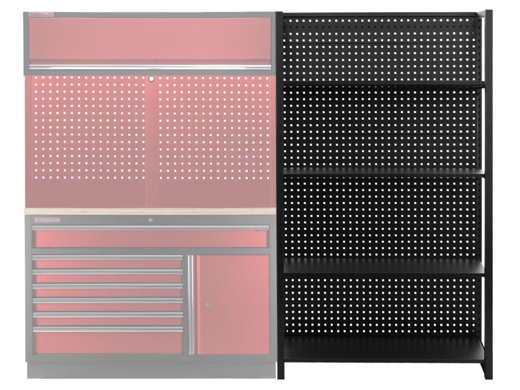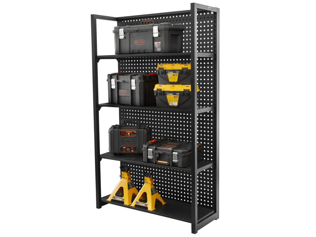 Stabilitu regálu zajišťují dvě bočnice a zadní děrovaná deska, která lze také využít pro zavěšení drobného nářadí pomocí háčků (háčky nejsou součástí balení).