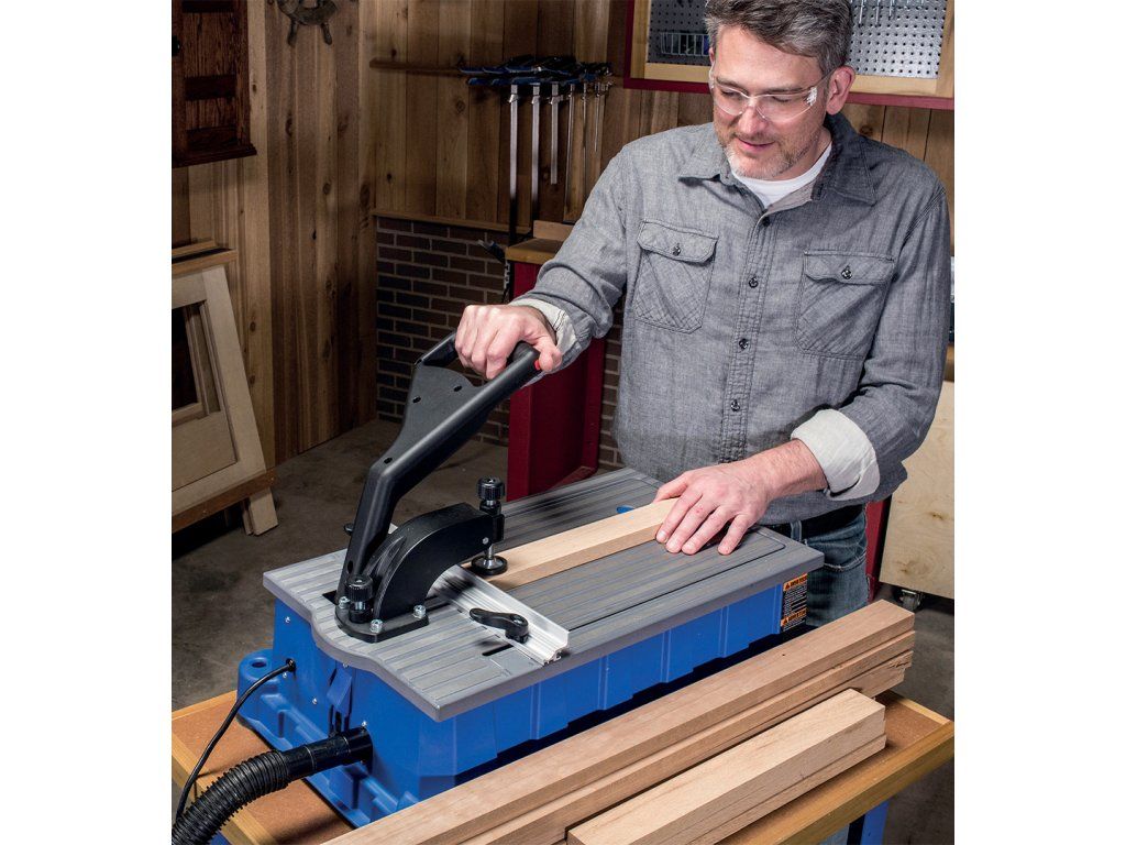 S tímto strojem můžete opakovaně vyvrtávat skryté spoje rychle a přesně. Zatáhnutím za ovládací rukojeť se spustí výkonný 110V motor, obrobek se pevně upne na stole a stačí už jen vrtat. Vždy stejný a přesně umístěný skrytý spoj vyvrtáte v materiálech o tloušťce 12-38 mm. Pro přesné vyvrtání skrytých spojů je stroj vybavený pravítkem a dorazy pro opakované vrtání. Na stole jsou navíc vyryté značky usnadňující umístění pravítka podle tloušťky materiálu.