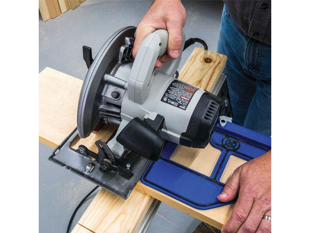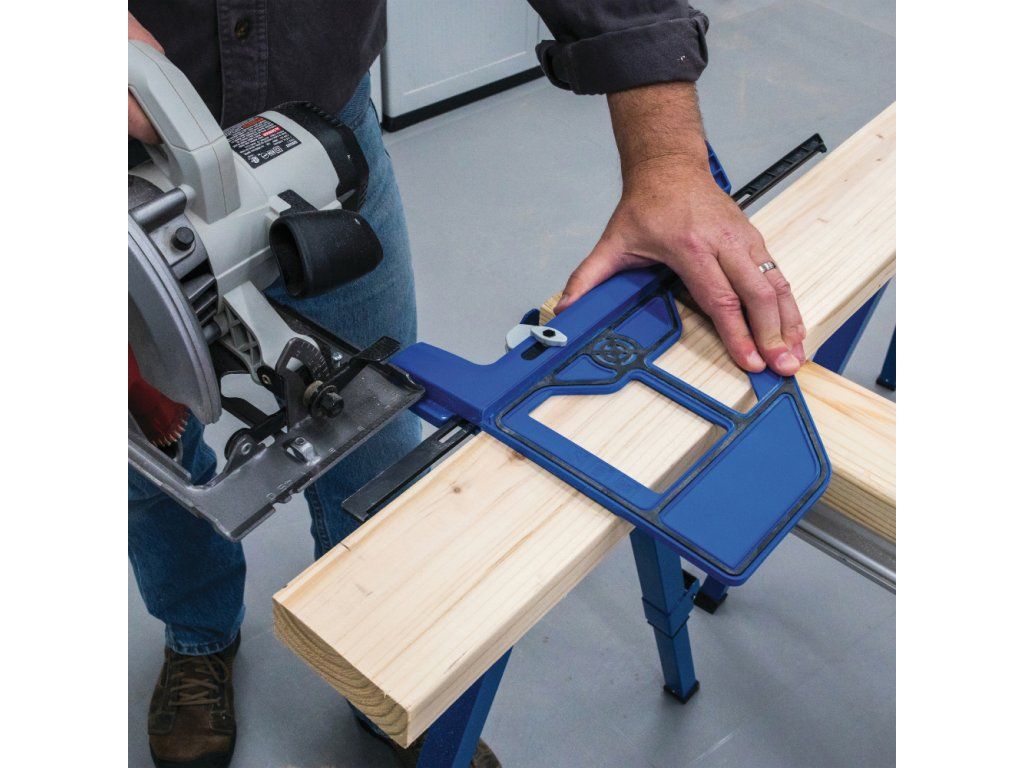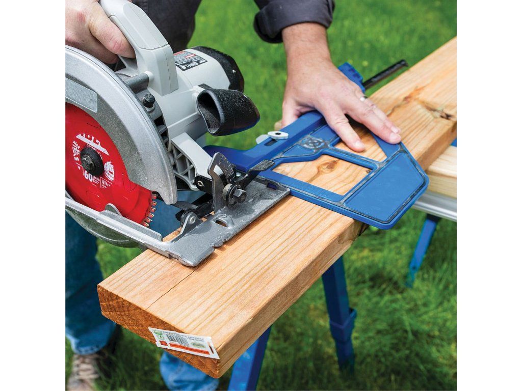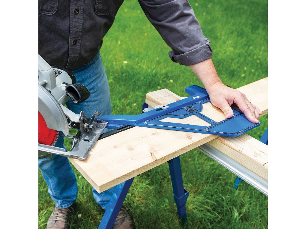 Vodící šablona vám umožní rychle a přesně řezat prkna široká až 203 mm a pod úhlem 45° pouze za použití okružní pily. Stačí označit místo řezu tužkou a srovnat se zatažitelnými ukazateli řezu.