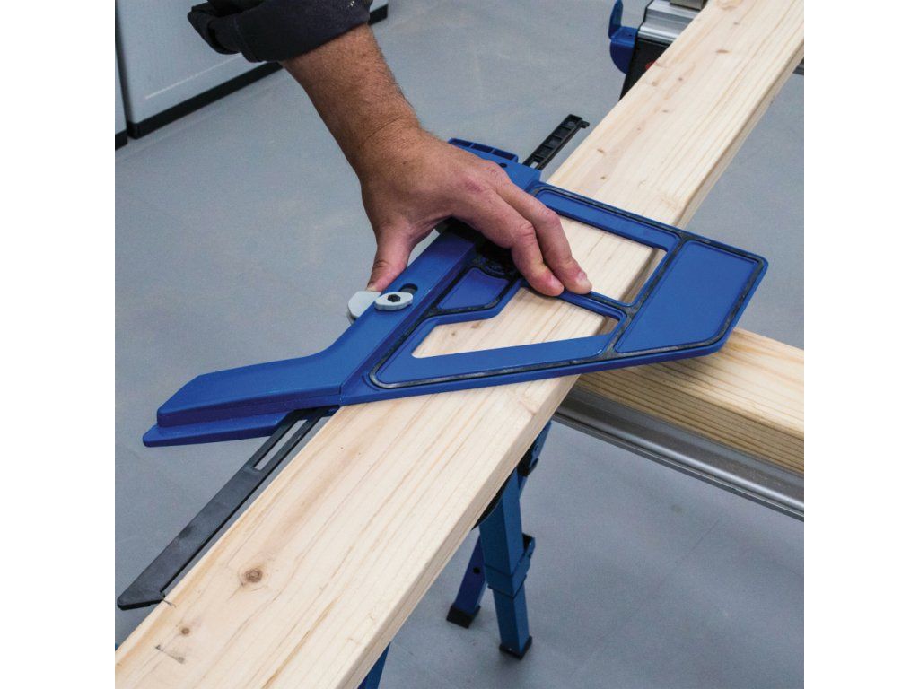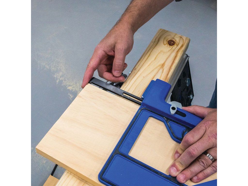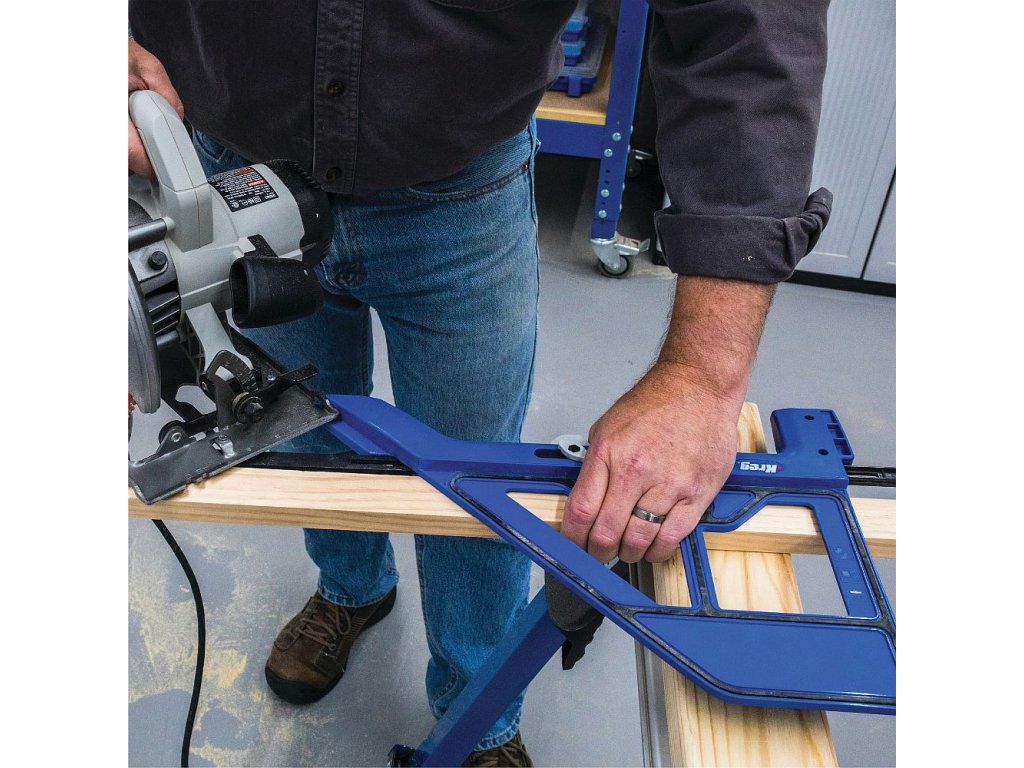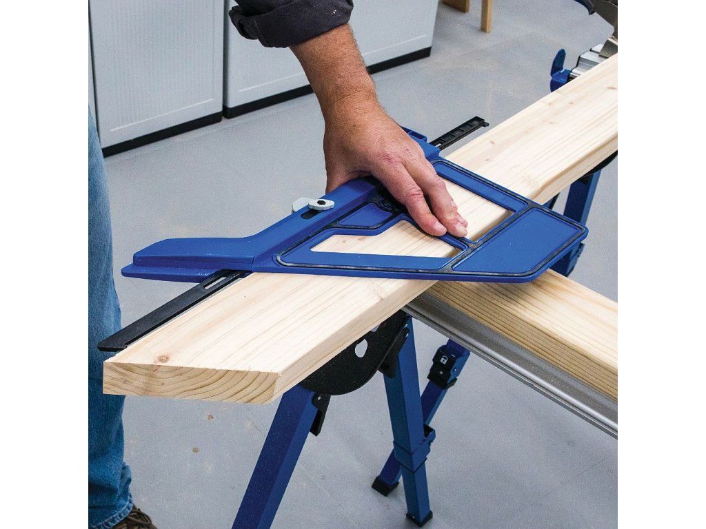 Vodící šablona vám umožní rychle a přesně řezat prkna široká až 203 mm a pod úhlem 45° pouze za použití okružní pily. Stačí označit místo řezu tužkou a srovnat se zatažitelnými ukazateli řezu.