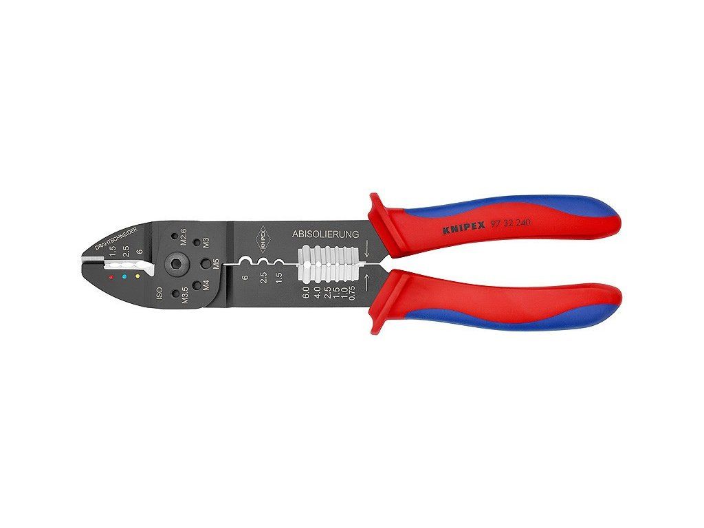- K stříhaní kabelů, odizolování drátů a lisování izolovaných a neizolovaných kabelových ok a konektorů a otevřených konektorů