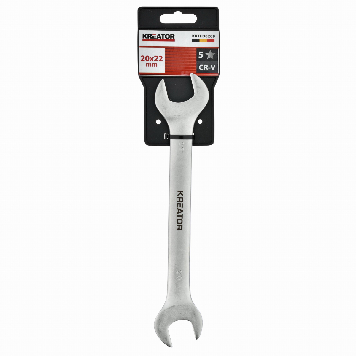 Tento dvojitý otevřený klíč KRTH30208 značky Kreator má délku 225 mm a je vyroben z vysoce kvalitního chrom-vanadiového slitiny. Konce mají otvory různých velikostí. Jeden je široký 20 mm a druhý 22 mm.