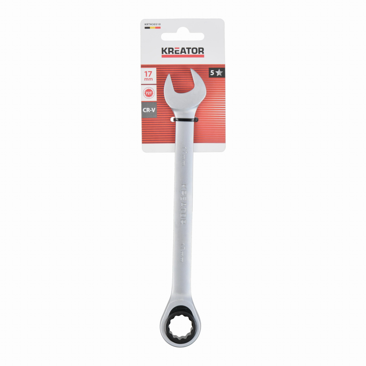 Tento kombinovaný očko ráčna / otevřený klíč KRTH30510 od Kreator je vyroben z vysoce kvalitní chrom-vanadiové slitiny. Délka klíče je 222 mm a má průměr 17 mm. Očko je opatřeno kvalitním strojkem, který má 72 zubů.