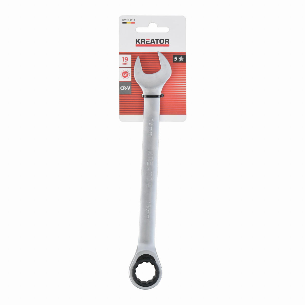 Tento kombinovaný očko ráčna / otevřený klíč KRTH30512 od Kreator je vyroben z vysoce kvalitní chrom-vanadiové slitiny. Délka klíče je 238 mm a má průměr 19 mm. Očko je opatřeno kvalitním strojkem, který má 72 zubů.