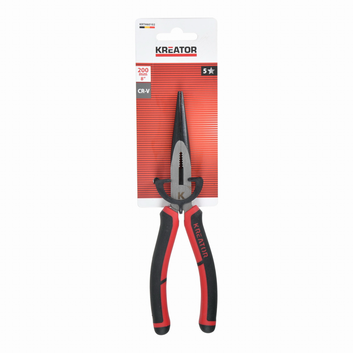 Tyto vysoce kvalitní kleště KRTH60102 od Kreator s dlouhými plochými čelistmi lze použít k držení, stříhání, odizolování a krimpování vodičů o průměru až 50 mm. Jsou vyrobeny z materiálu CR-V s povrchovou úpravou satin a mají délku 200 mm. Měkké gumové rukojeti poskytují pevný, protiskluzový úchop a pohodlné používání.